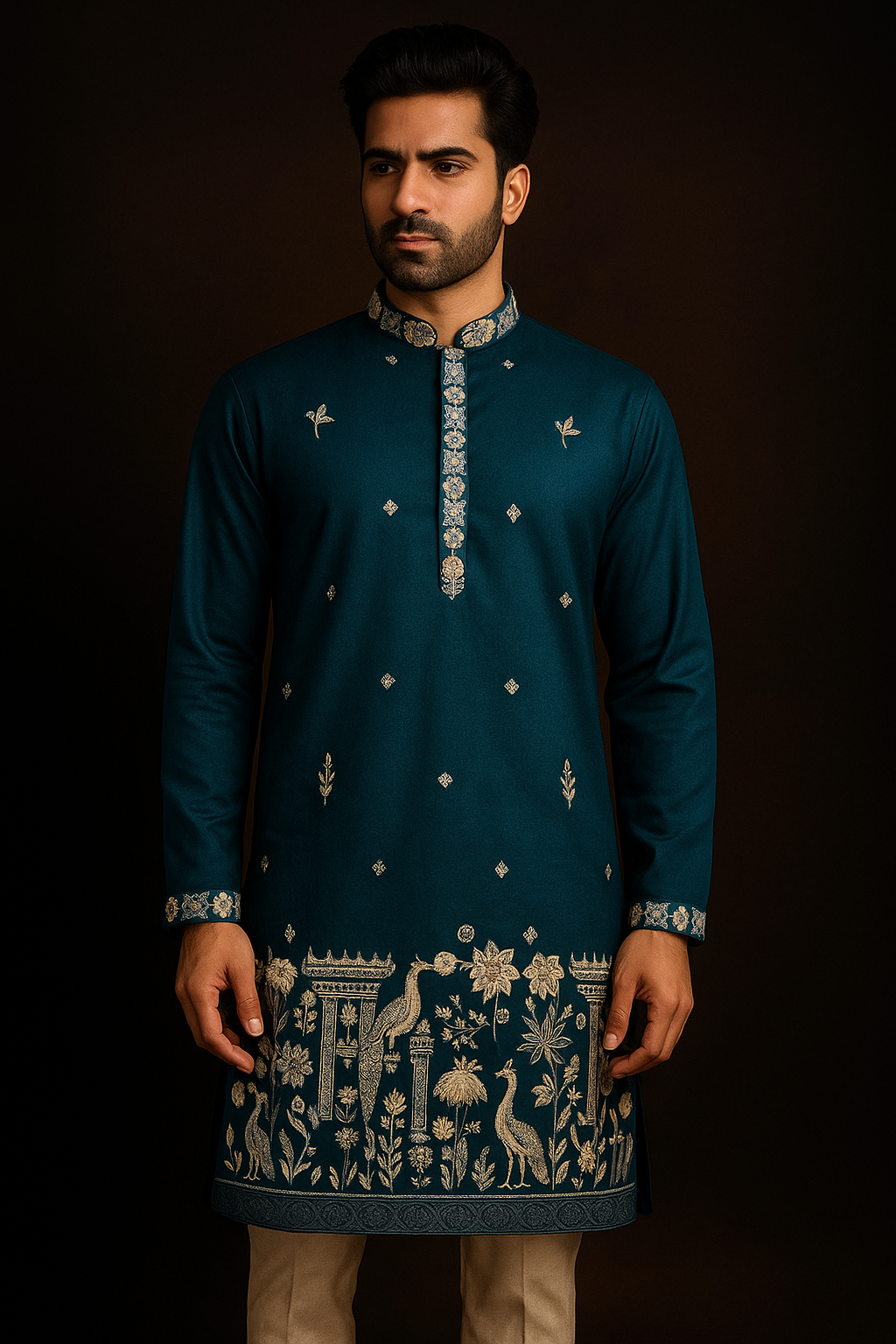 A luxurious teal blue kurta featuring premium multi-thread embroidery with detailed peacock and floral motifs. Perfect for weddings, festivals, and grand celebrations.