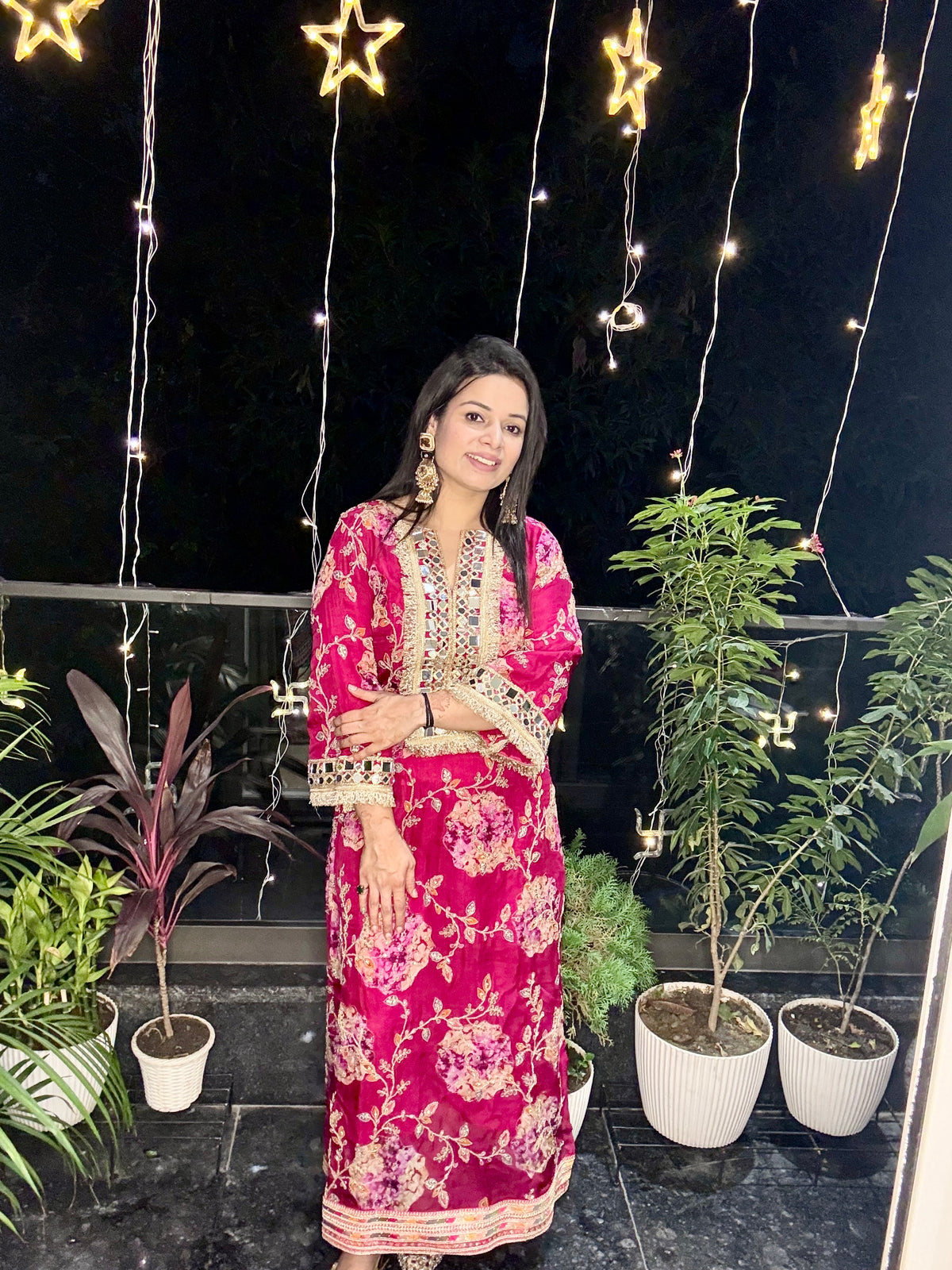 Stunning rani pink kurta set with mirror work and floral embroidery. A vibrant choice for festive celebrations.